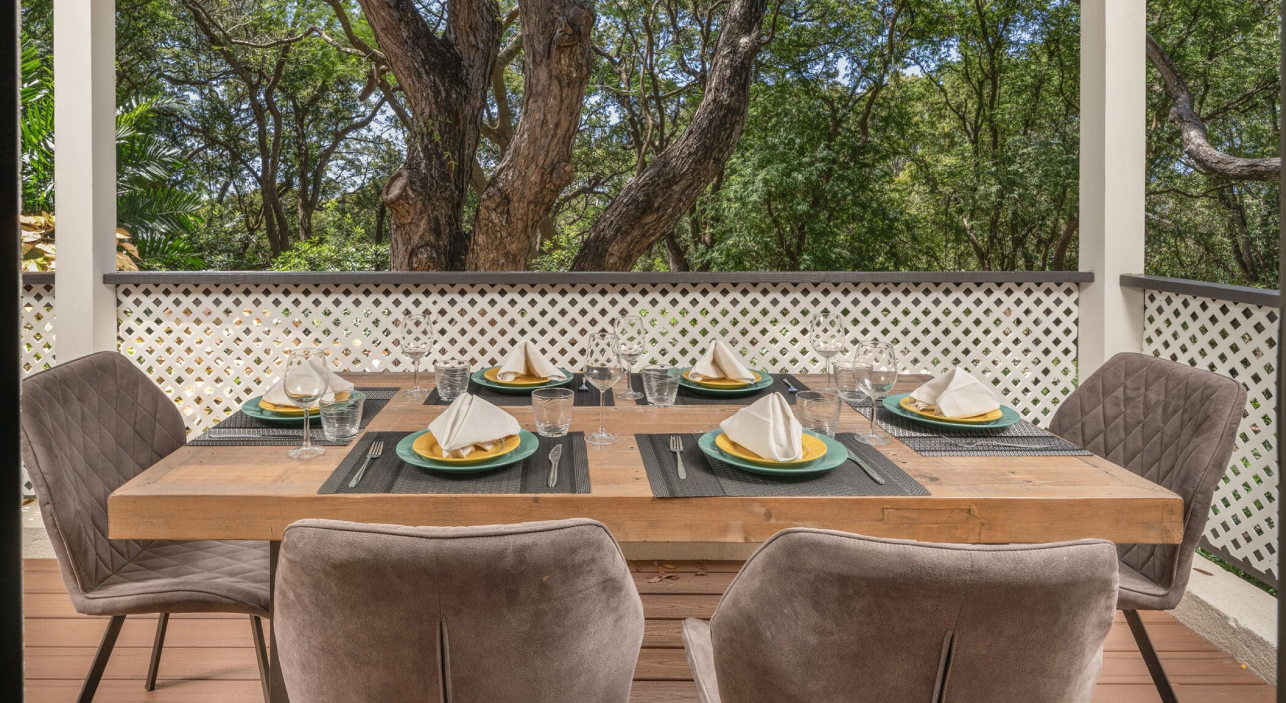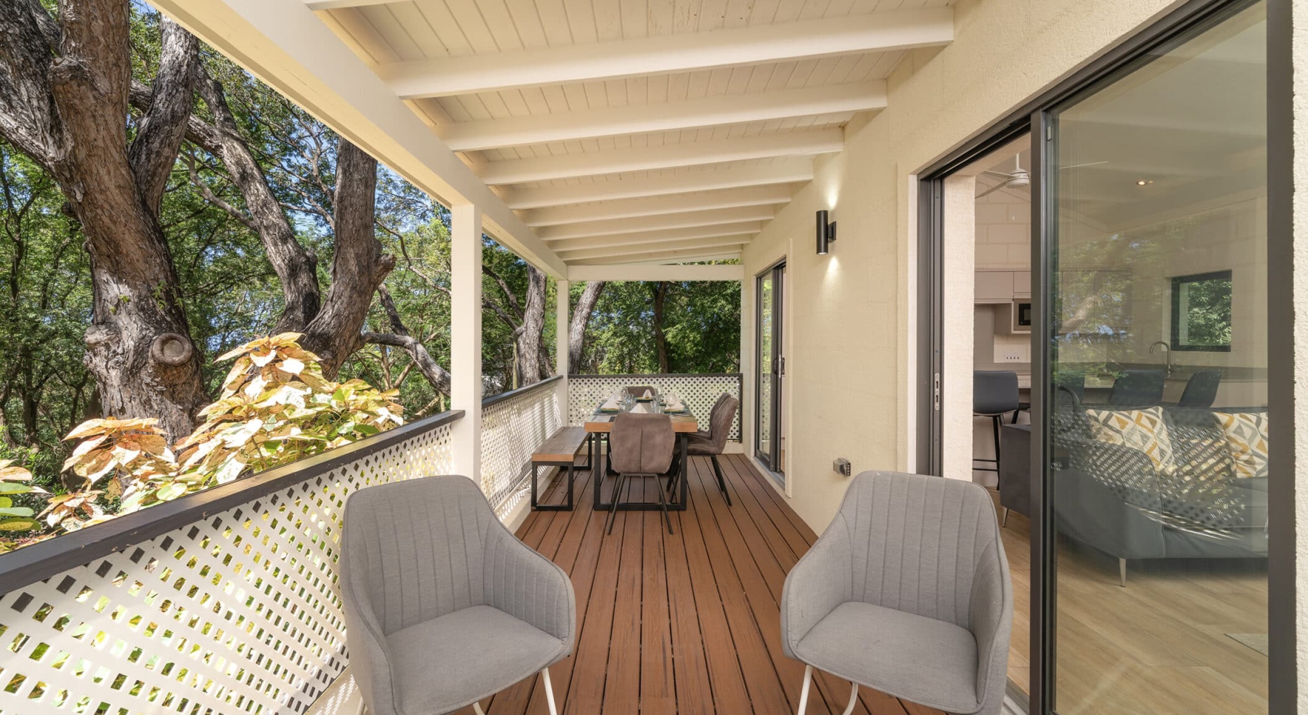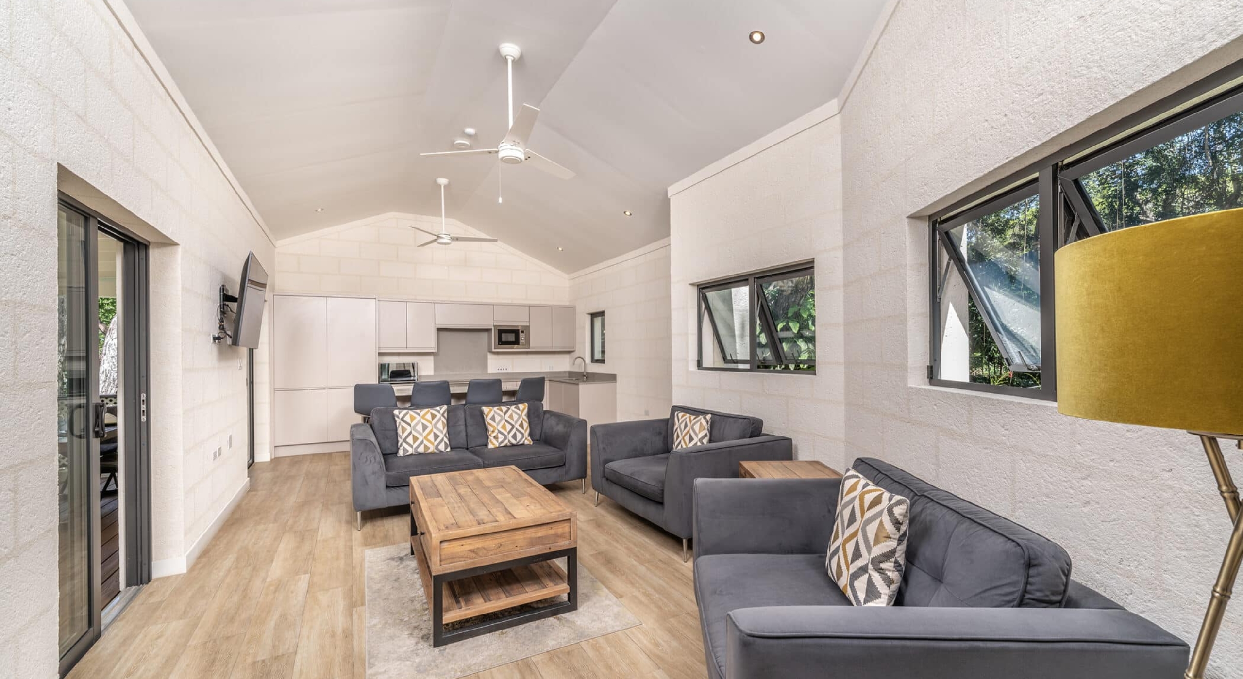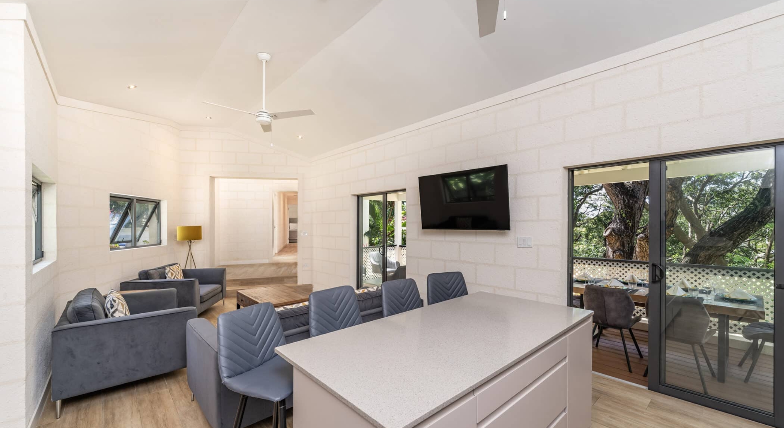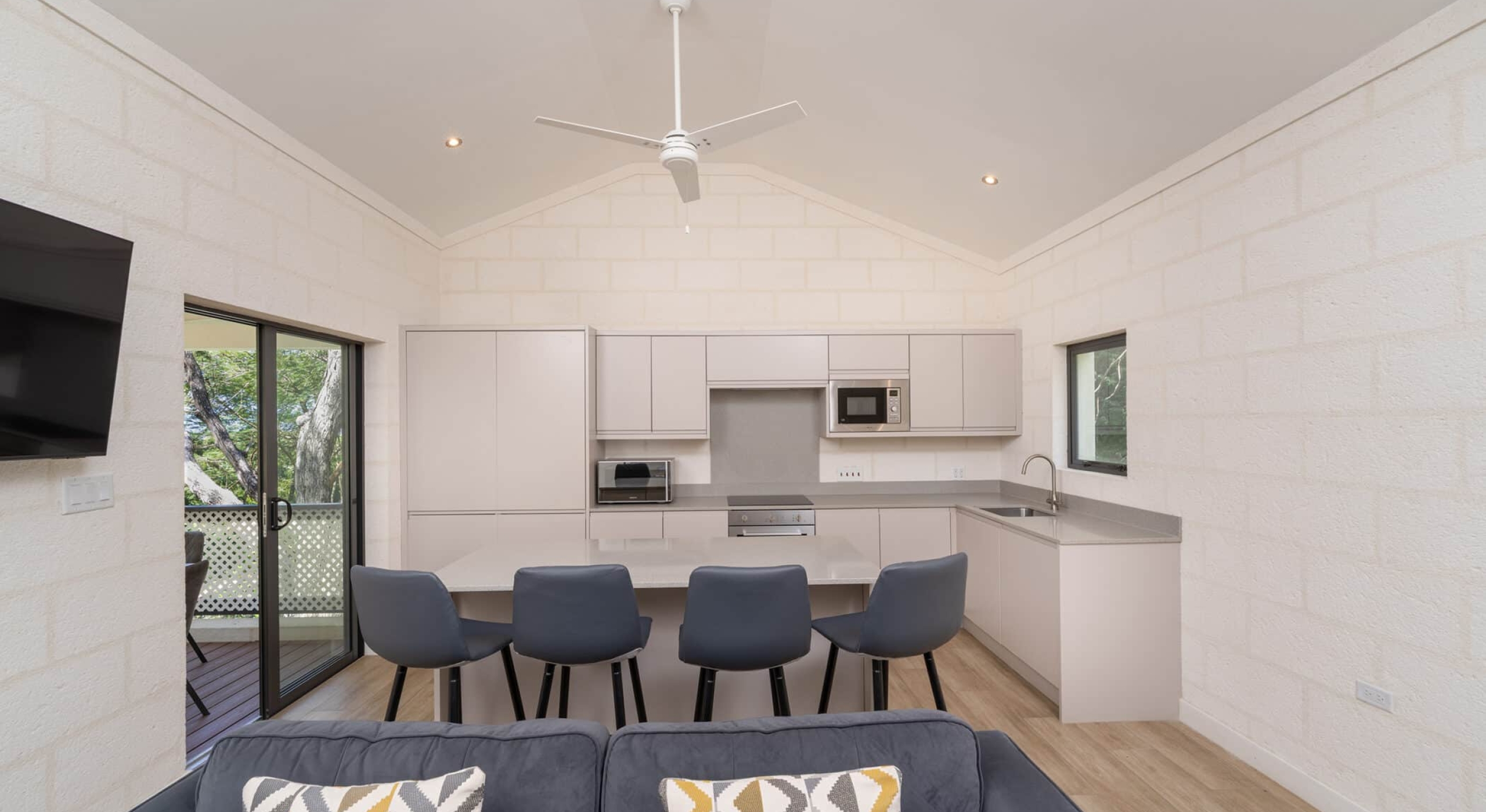 Step inside this modern and contemporary cottage to discover a brand-new fully equipped kitchen, seamlessly flowing into the outdoor dining and lounging area. Relax in the comfortable seating area, complete with a TV and breakfast bar, before stepping out onto the covered terrace.