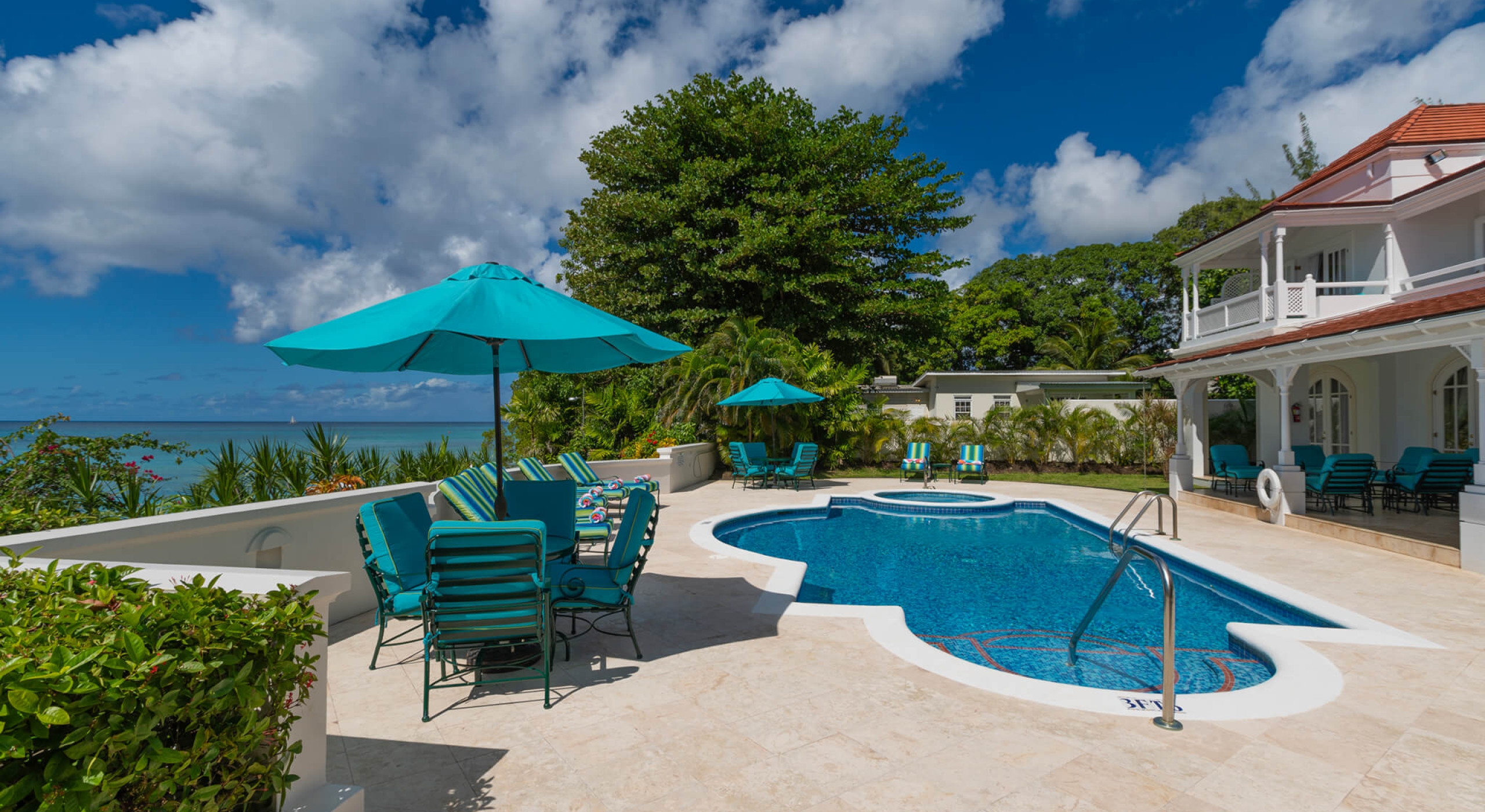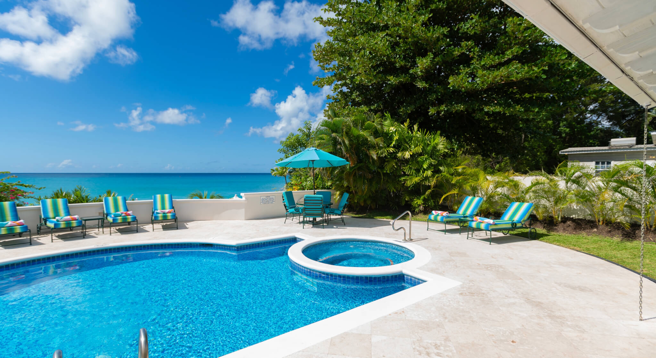 The pool deck offers a panoramic view, providing privacy and uninterrupted sight of the beautiful coral sand beach and turquoise ocean from its elevated position.