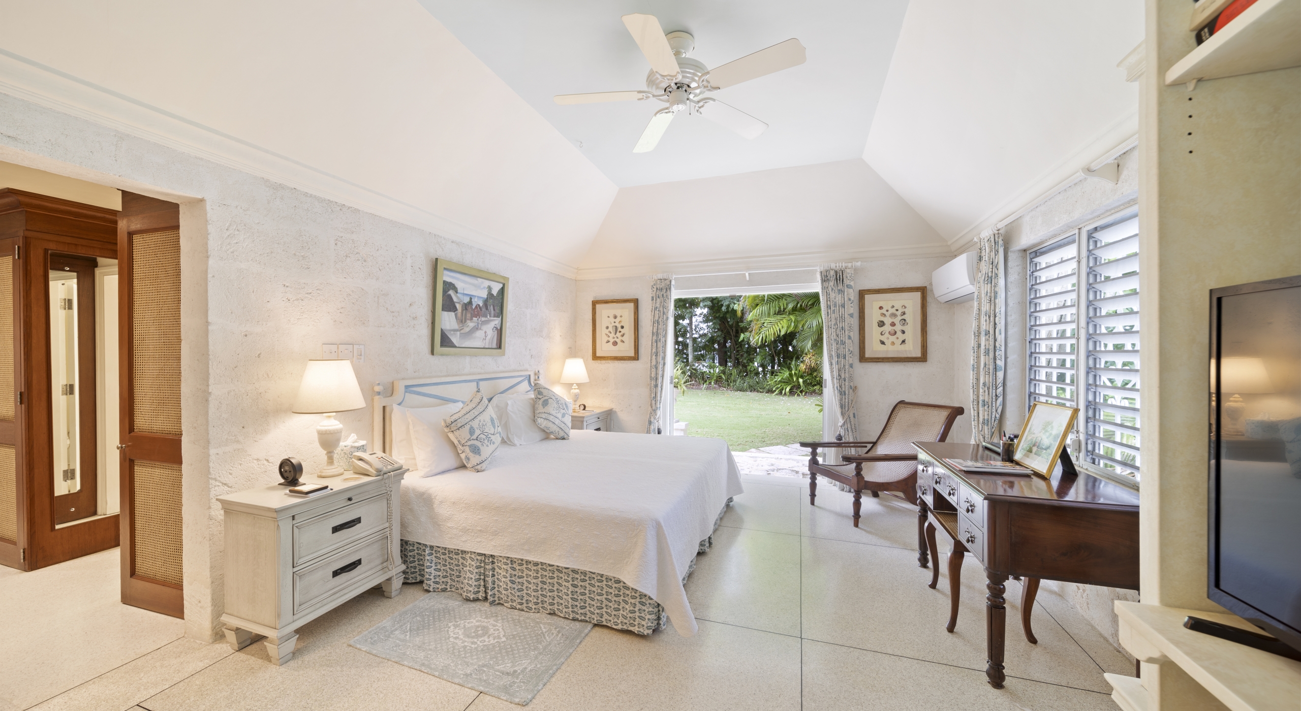 The main house has a wonderful open area courtyard with fishpond which is perfect for enjoying a morning coffee before heading to the outside dining room to enjoy breakfast prepared by your own private cook. Guests can also enjoy lounging in the open plan living and formal dining area which has large sliding doors to allow cool breezes through and enjoy the views of the Caribbean Sea.