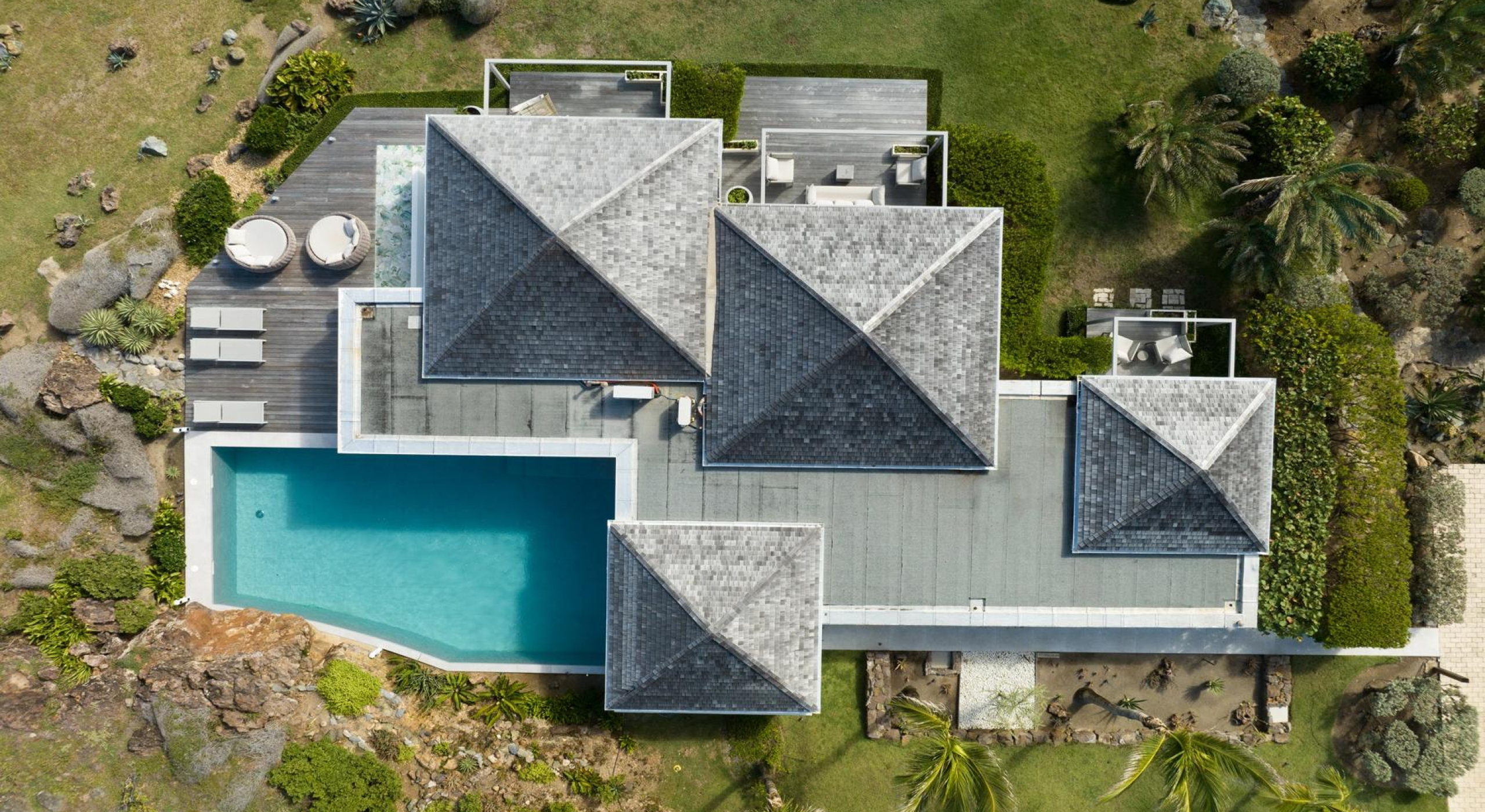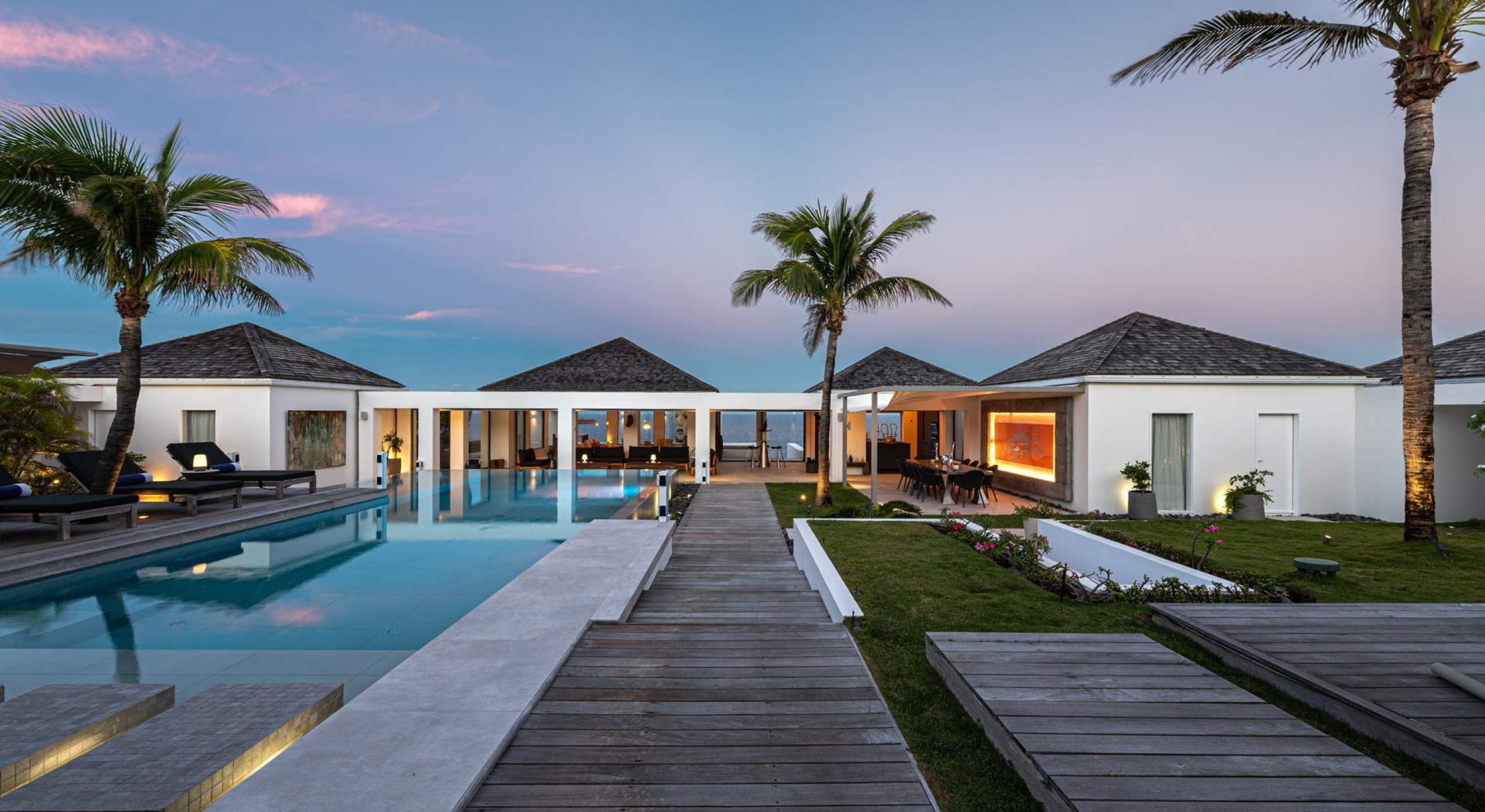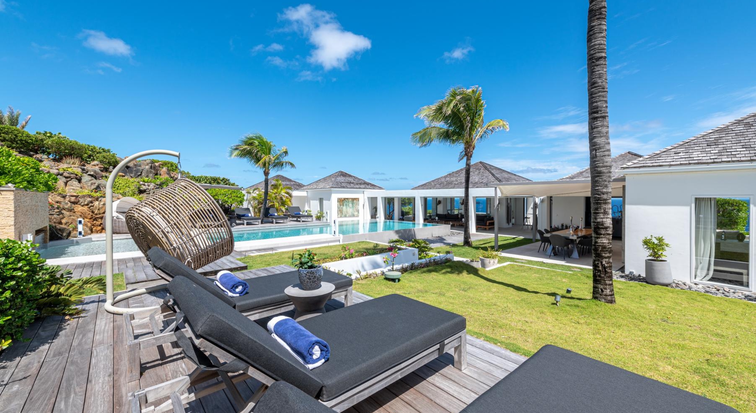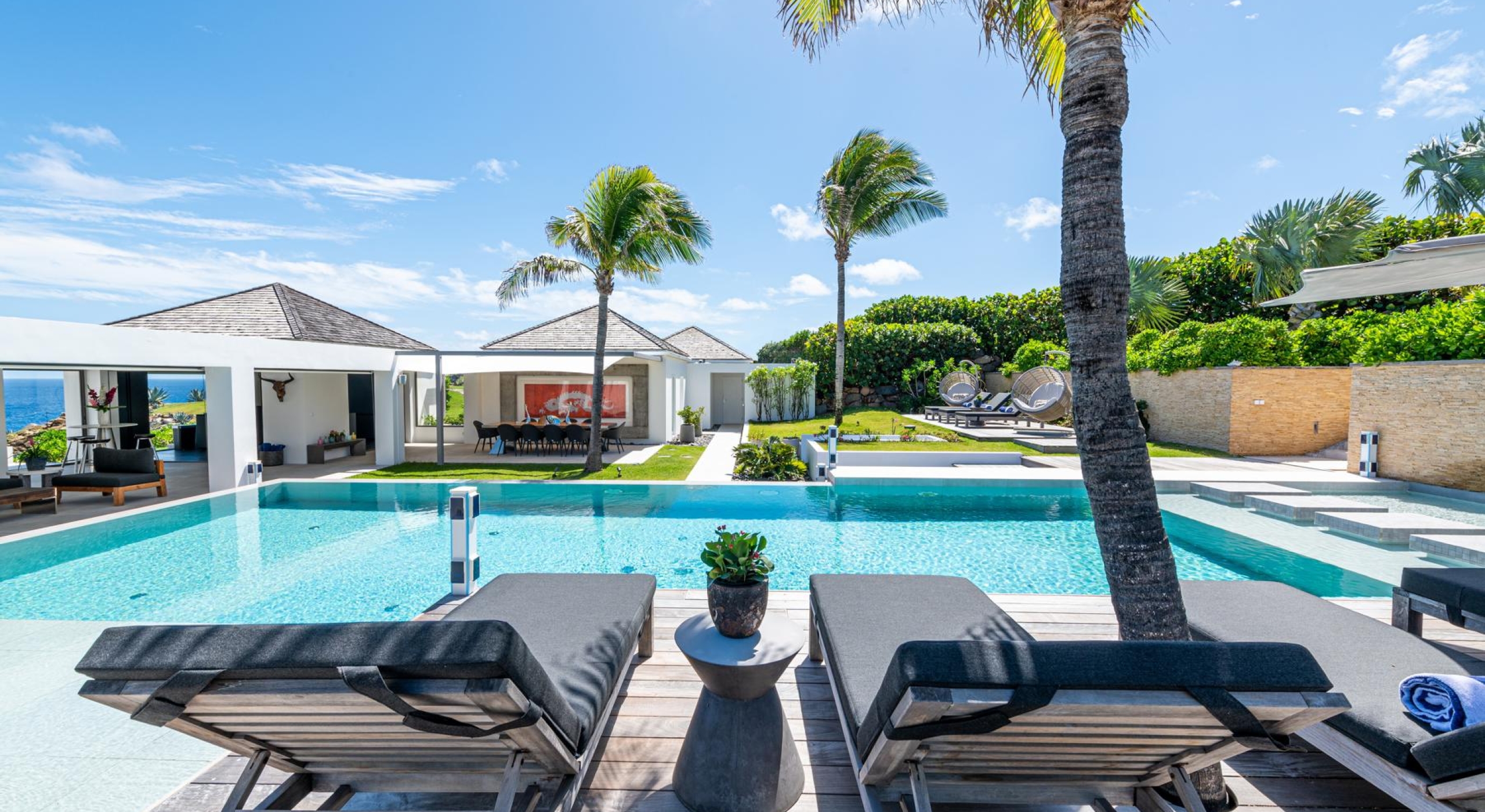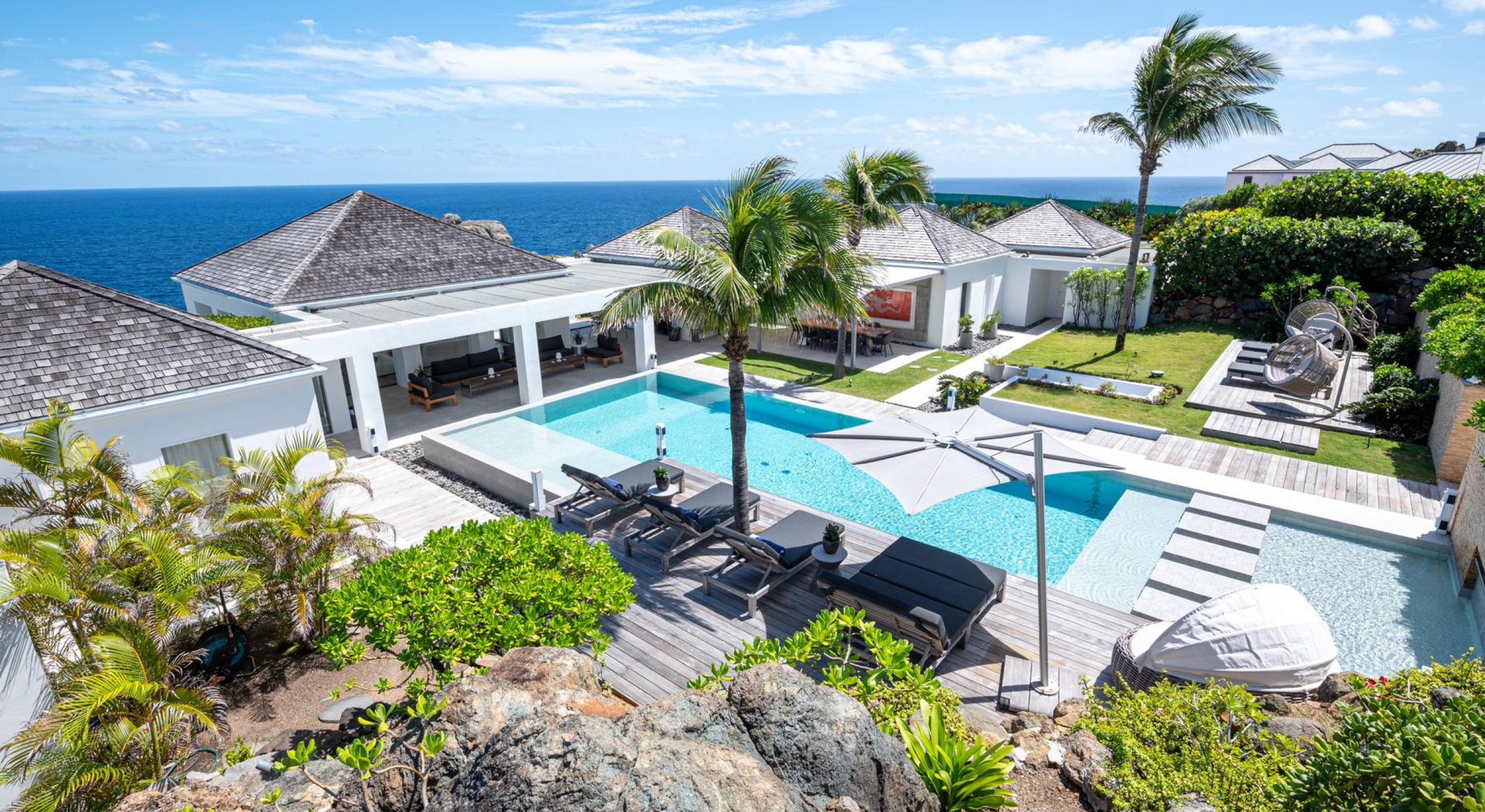 Outside, a lush tropical garden surrounds two swimming pools, one of them heated and stretching 20 meters, as well as a seafront jacuzzi, multiple furnished terraces, and a shaded outdoor dining area with barbecue.