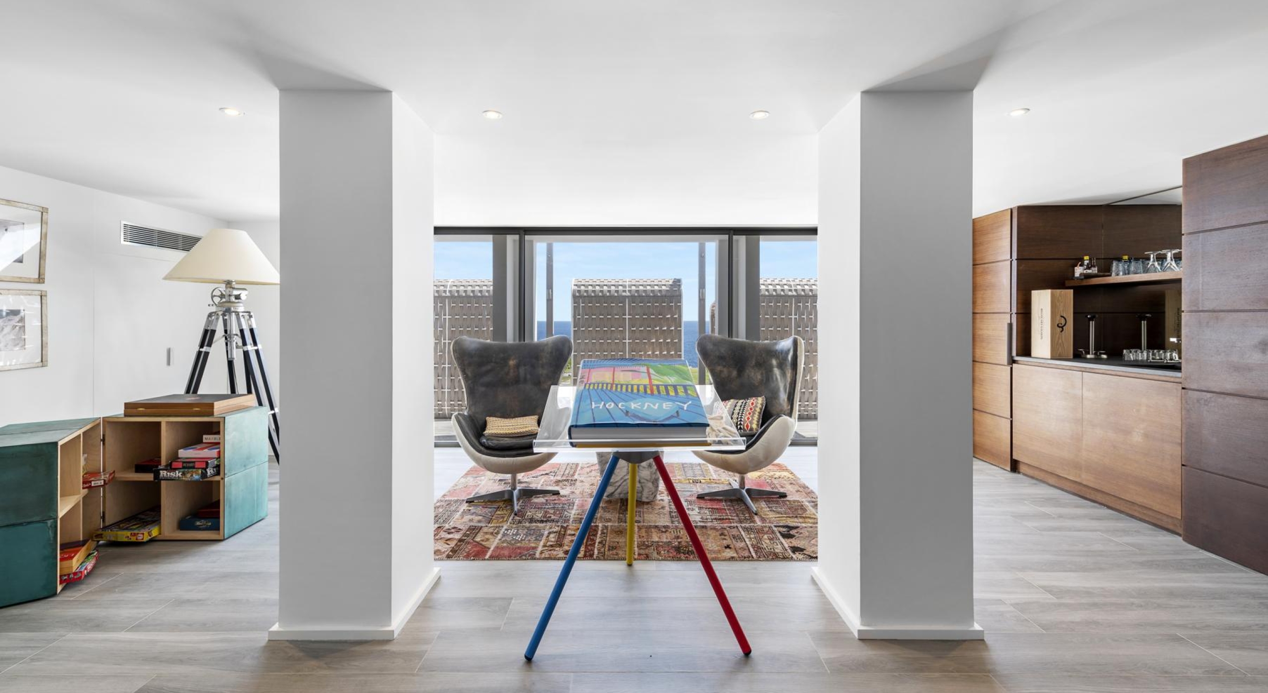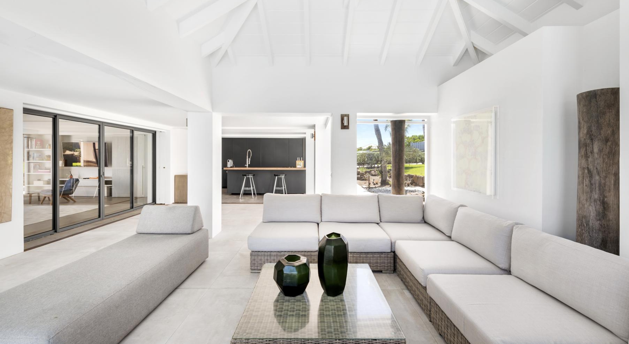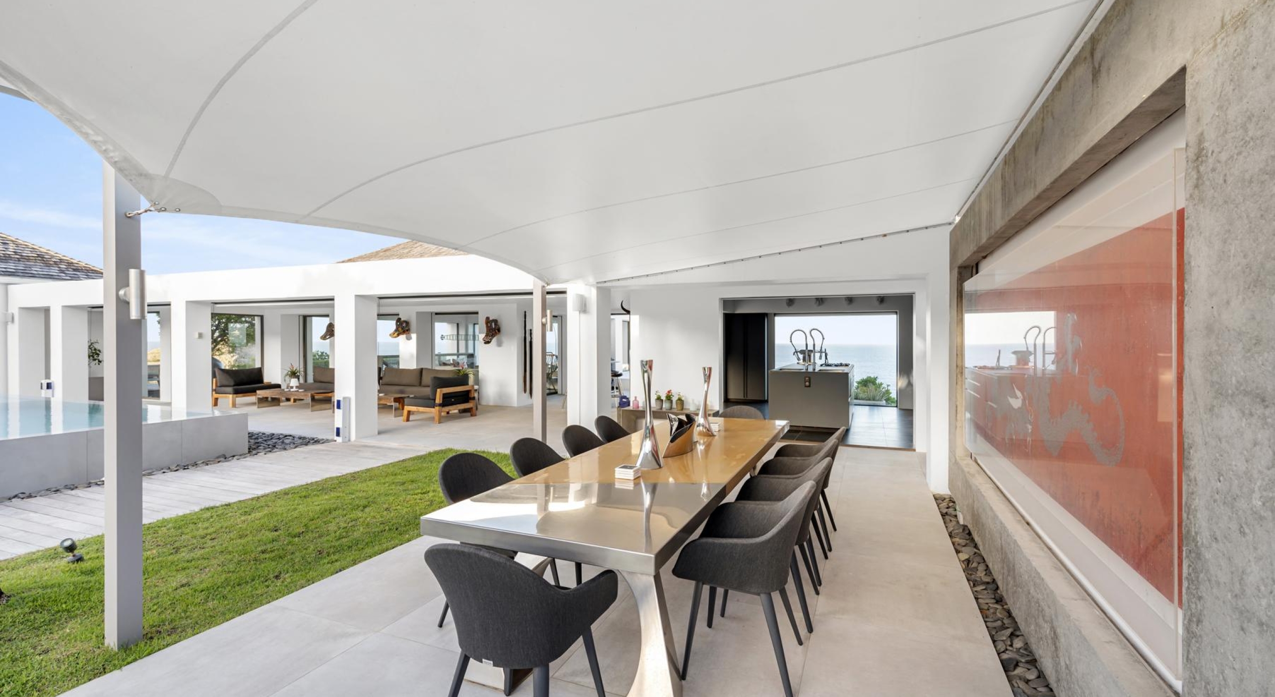 The living spaces, open to the outdoors, are filled with natural light and adorned with carefully curated designer pieces. The lounge, professional kitchen, and dining area come together in a harmonious flow that is both sophisticated and welcoming.