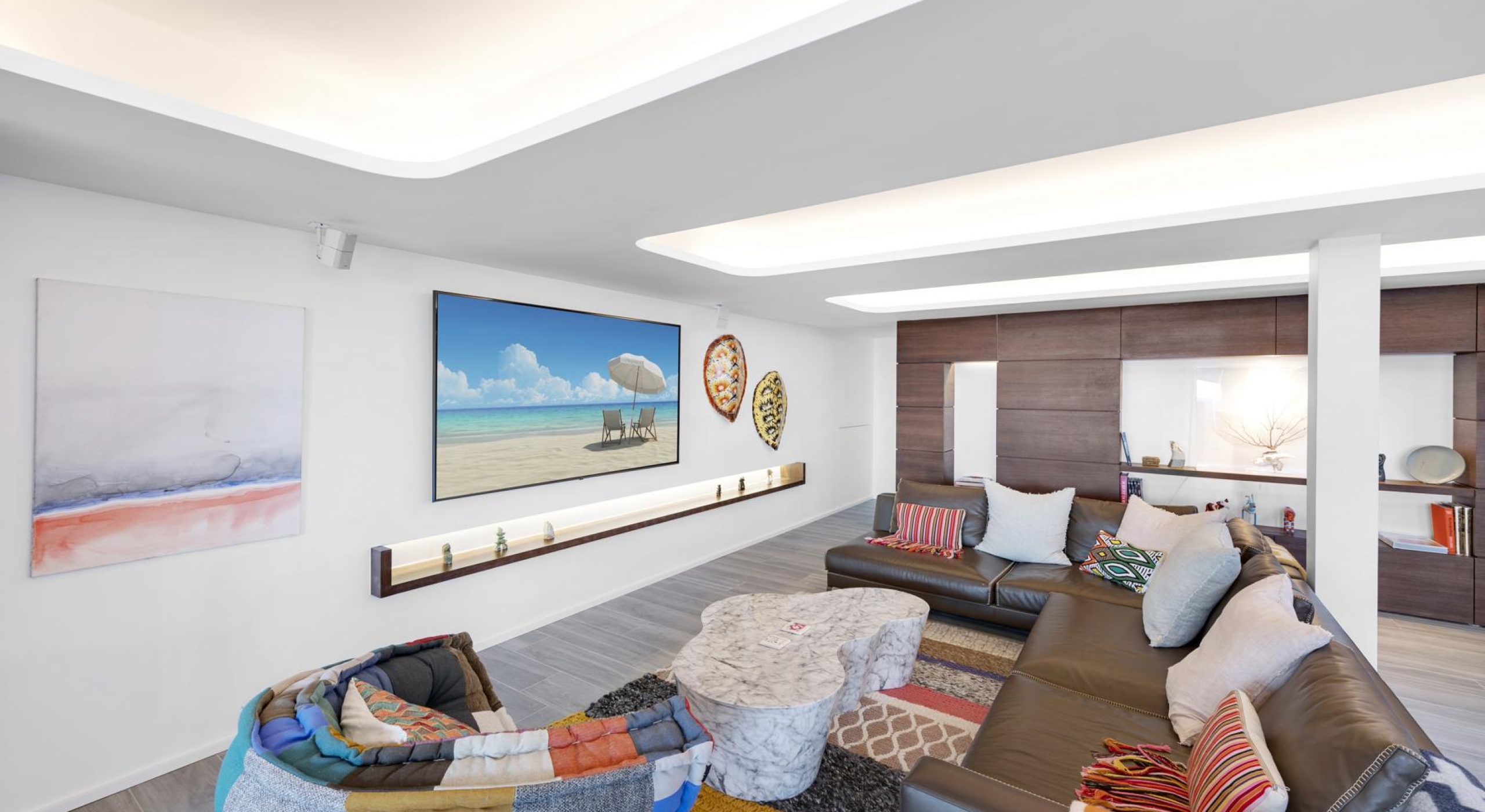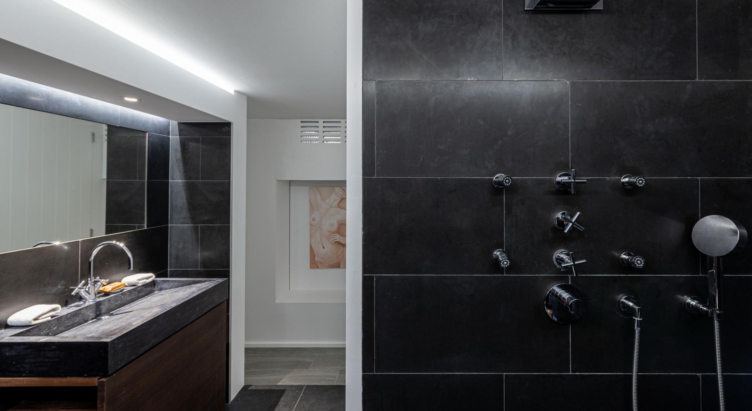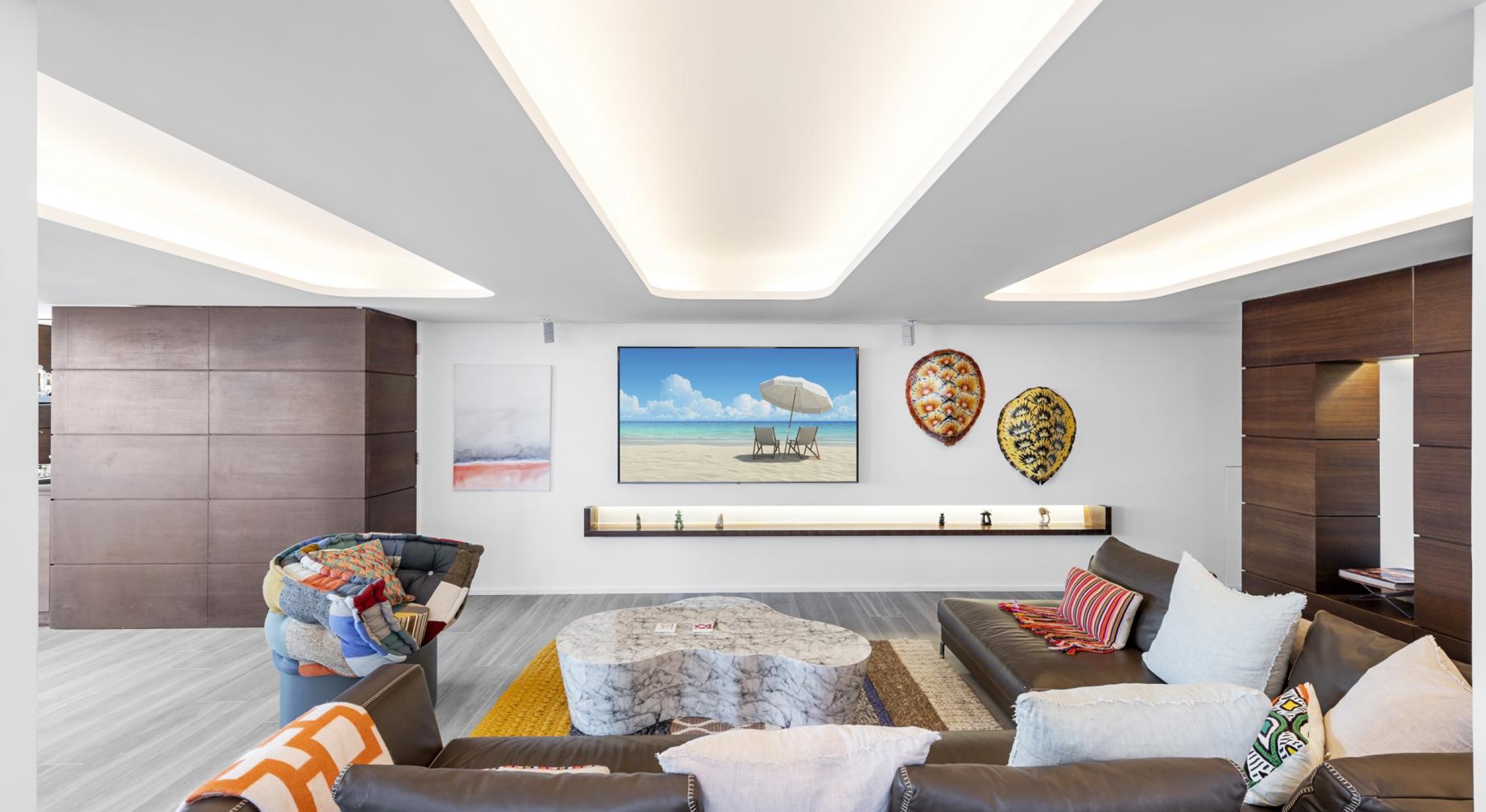 The living spaces, open to the outdoors, are filled with natural light and adorned with carefully curated designer pieces. The lounge, professional kitchen, and dining area come together in a harmonious flow that is both sophisticated and welcoming.