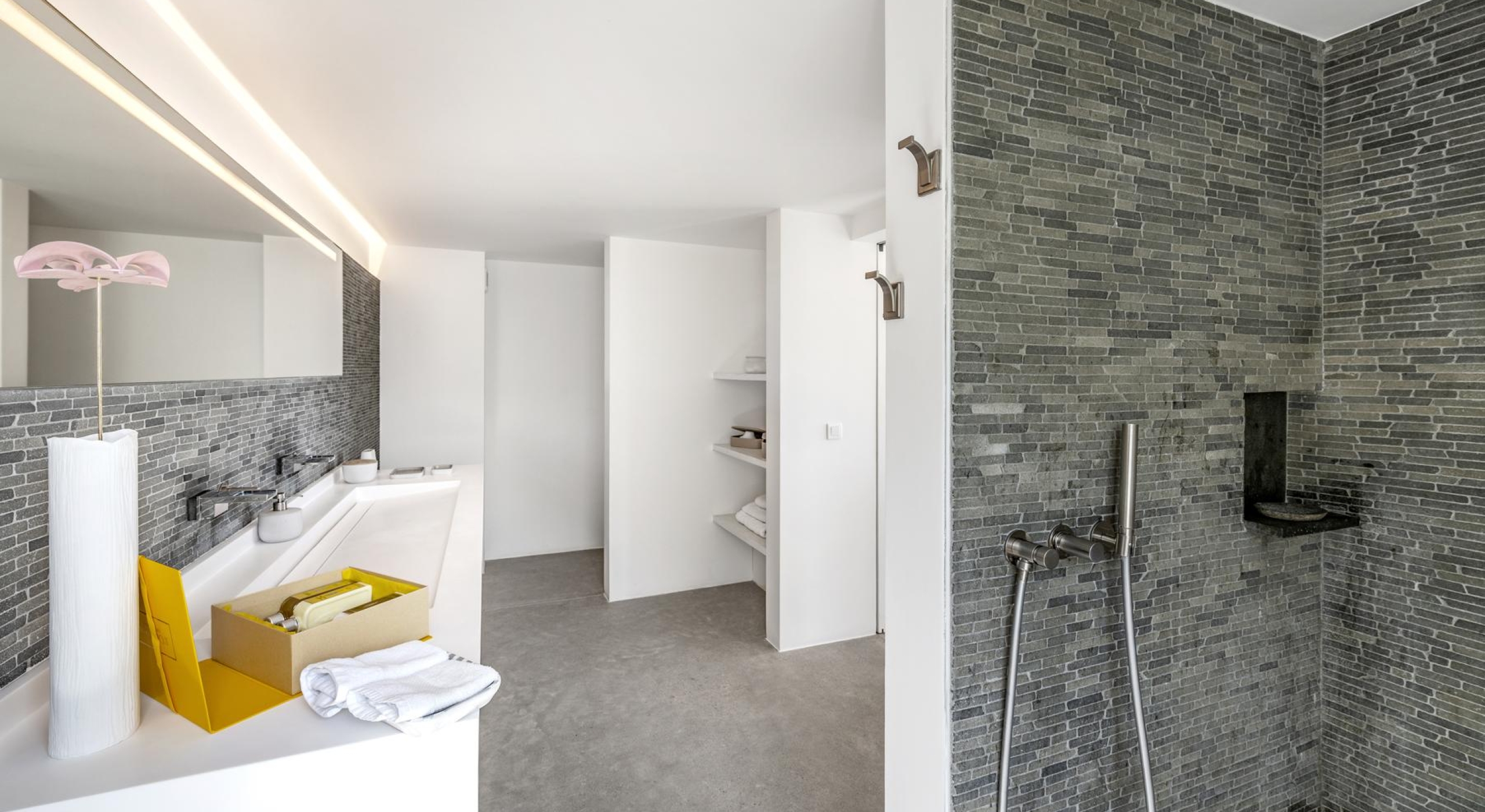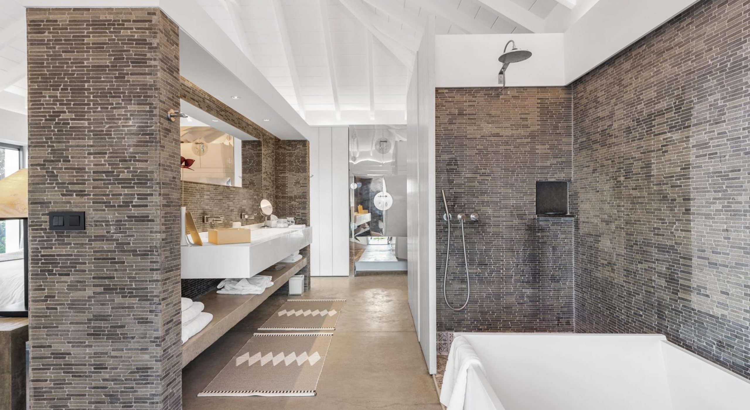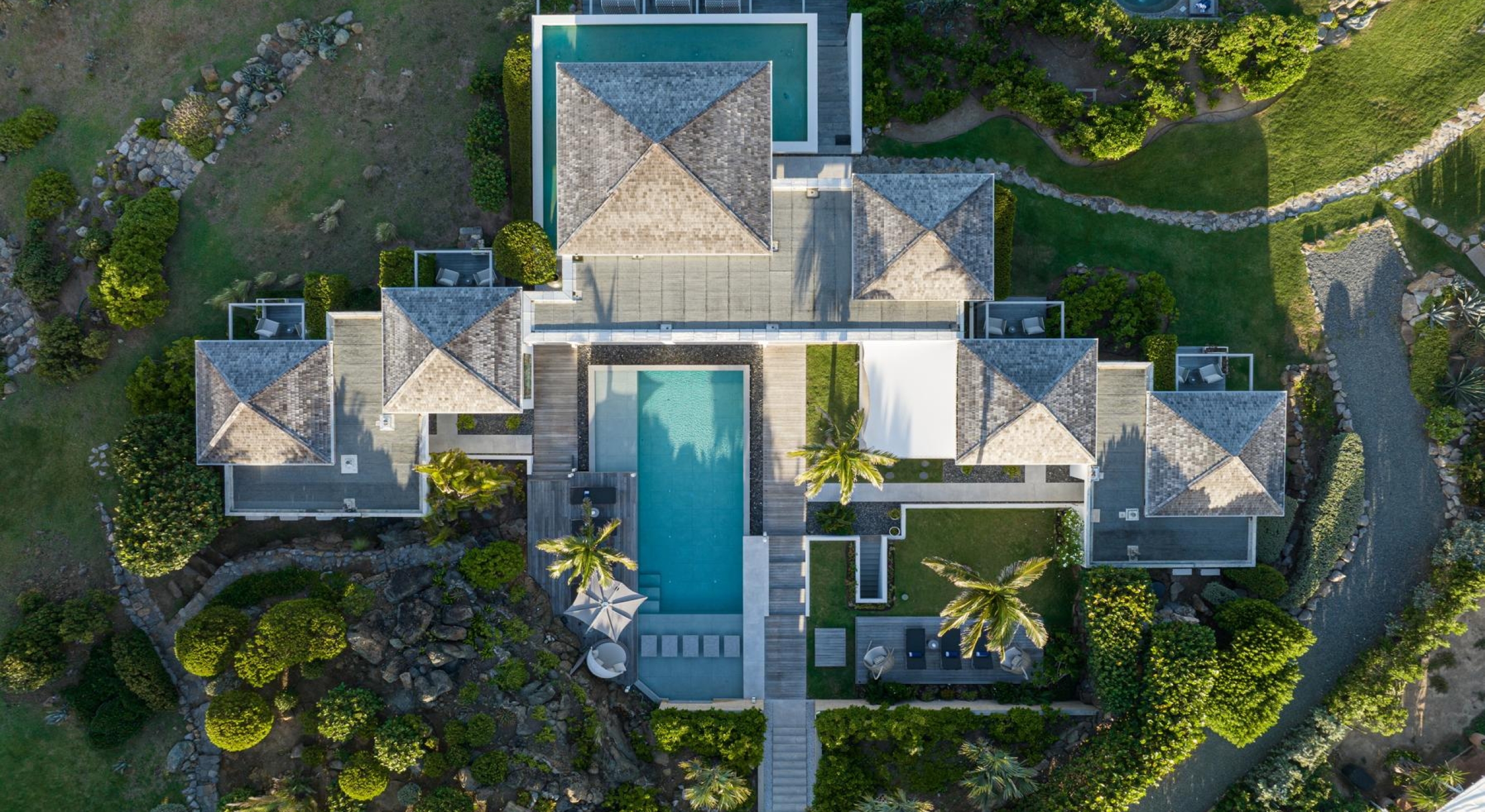 The villa features six independent suites, spread across the main house and a secondary pavilion. Each offers its own terrace, en-suite bathroom, and a refined design that blends modern comfort with understated elegance.