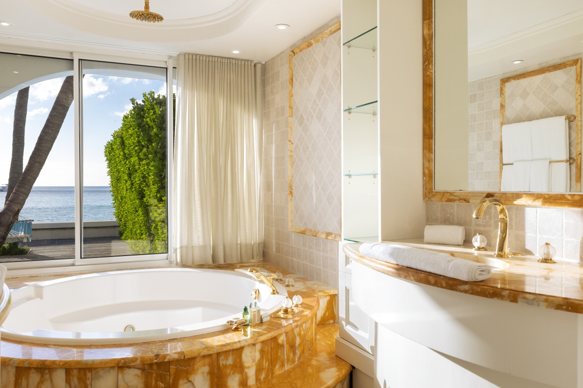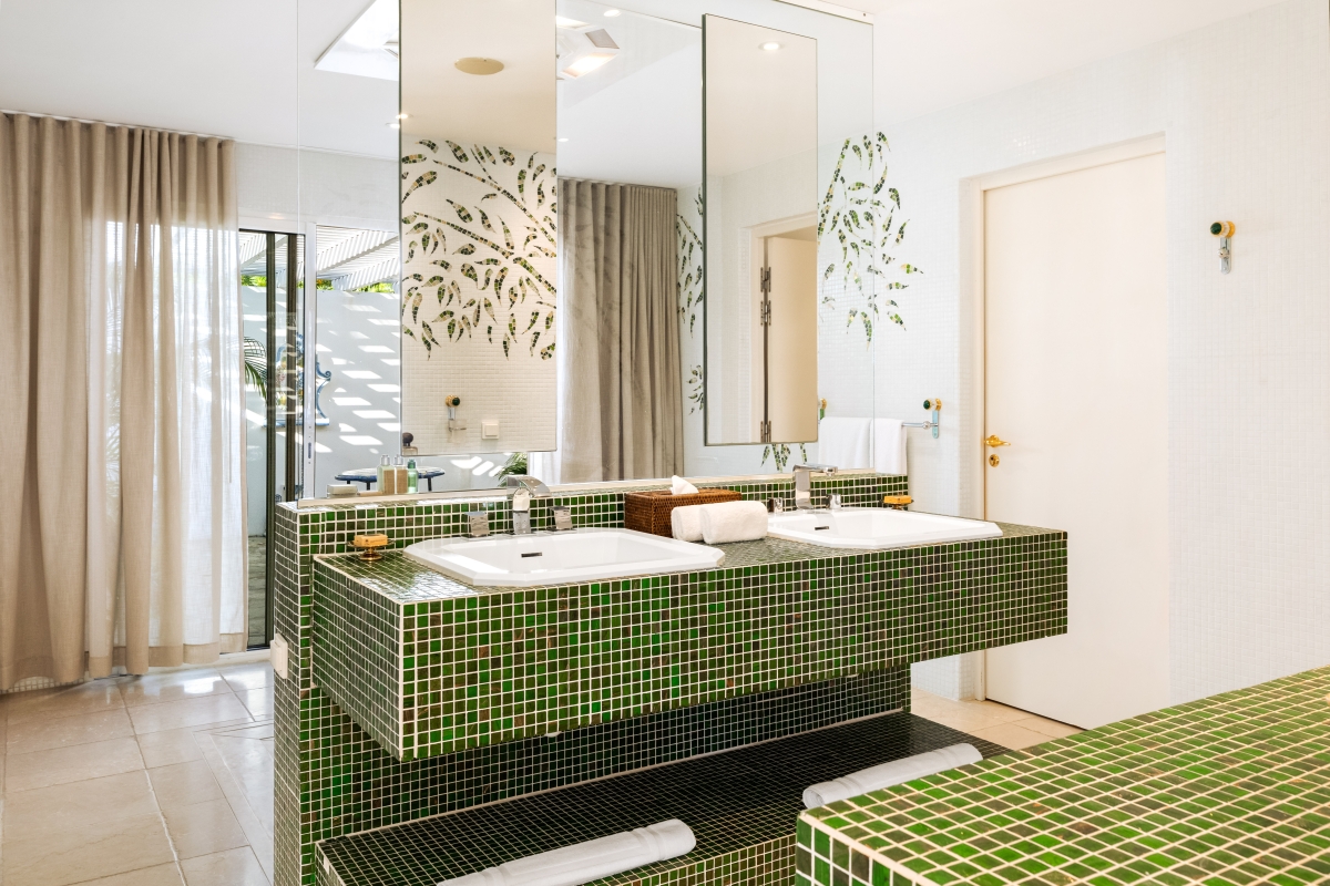 Four of the five-bedroom suites have sea views and are located within the main house. The fifth bedroom sits in a private casita off the courtyard. The master suite, with a private terrace overlooking the sea, sits in a private oasis at the top of a marble staircase. Every bedroom suite within the main house is a blend of refined contemporary overlaid with touches of opulence. Each bathroom is a work of art with semi-precious stone fixtures and tubs plus overhead showers. Several have ocean views and private patios.